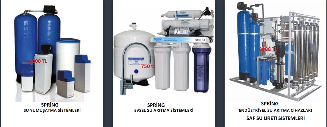 Spring su arıtma ürünlerini her geçen gün daha da yaygınlaştırıyor. Su arıtma denilince ilk akla gelen marka olan spring su arıtma evsel su arıtma denilince ilk akla gelen marka olma yolunda hızla ilerliyor. Su arıtma ve su arıtma servisi denilince ilk akla denilince su Spring denilmesinin ağırlığı asaleti üzerimize çökmüşken su arıtma cihazı satın almak için bizleri arayan insan sayısı her geçen gün artıyor. Su arıtma ve su arıtma servisi konusunda tecrübemizi her geçen gün artıyor. Su arıtma cihazı satın alan insanların büyük bir çoğunluğu öncelikli olarak su arıtma cihazını fiyatını daha sonra su arıtma cihazının kalitesini sorguluyor. Ancak su arıtma cihazının en önemli noktası yaygın servis ağı ve işinin ehli teknik servistir. Su yumuşatma cihazı, saf su üretim cihazı, ters ozmos su arıtma sistemleri, kum filtre, separatör filtre, mixpet reçine, karbon filtre, ters ozmos su arıtma cihazları için uzman kadromuzla sizlere tüm Türkiye de hizmet vermeye hazırız. Su arıtma bizim işimiz.